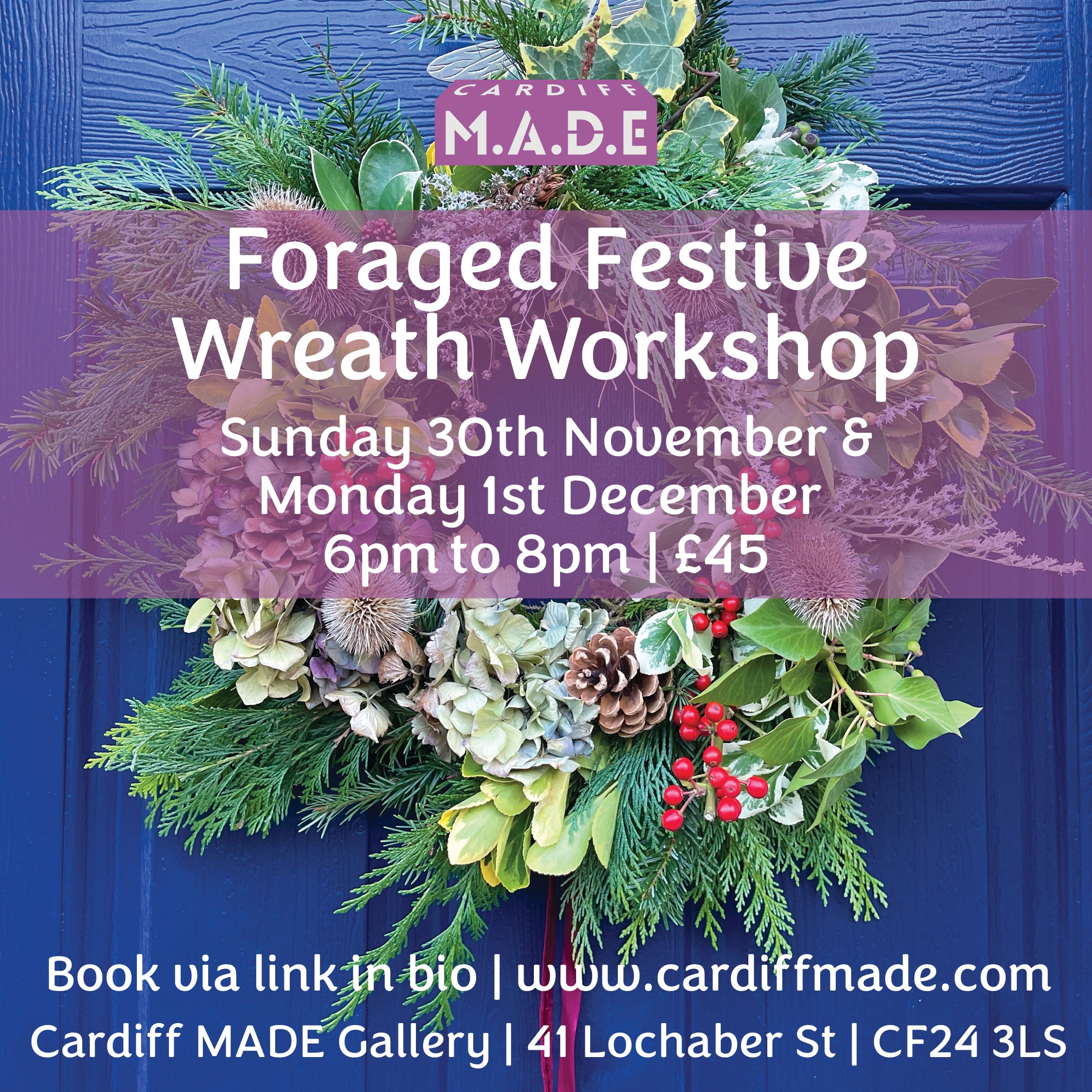 Cardiff MADE is delighted to present a wintery wreath making workshop using locally sourced flowers, foliage and largely biodegradable and reusable materials.
